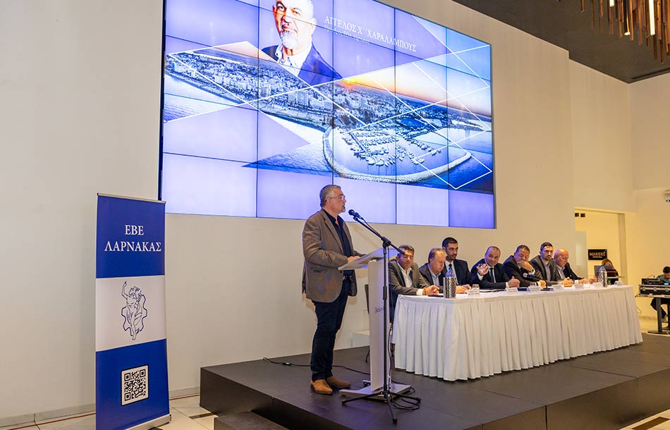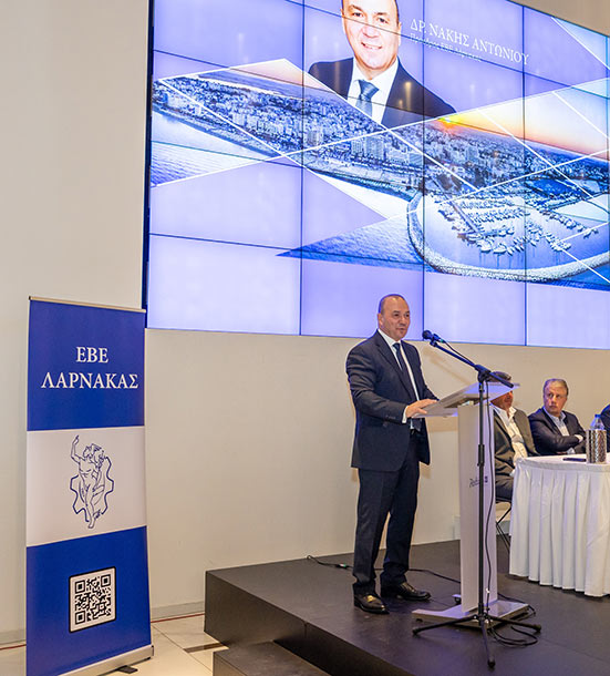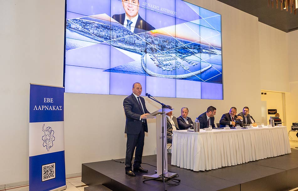 Η συνέλευση ολοκληρώθηκε με την ομιλία του Προέδρου Δρ. Νάκη Αντωνίου. Ο Δρ. Αντωνίου έκανε εκτενή αναφορά για τα όσα έχουν συμβεί και λαμβάνουν χώρα στην Πόλη και Επαρχία Λάρνακας και ειδικότερα στην υλοποίηση και την ανάπτυξη του Λιμανιού Μαρίνας. Αφήνοντας πίσω τα όσα έγιναν για το θέμα αυτό όπως τόνισε, ζήτησε την τάχιστη προώθηση των σχεδιασμών της κυβέρνησης για ξεχωριστή ανάπλαση των δύο θαλάσσιων πνευμόνων της πόλης μας. Από τις επαφές του ΕΒΕΛ σημείωσε, διαπιστώνεται ότι υπάρχει μεγάλο ενδιαφέρον από επενδυτές (ντόπιους και ξένους) για να συμμετάσχουν στο έργο αυτό.