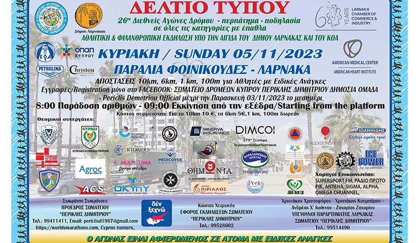 Το Εμπορικό και Βιομηχανικό Επιμελητήριο Λάρνακας στα πλαίσια των κοινωνικών δράσεων του συνδιοργανώνει μαζί με τον Δήμο Λάρνακας και τον ΚΟΑ σε συνεργασία με το Σωματείο Δρομέων Κύπρου Περικλής Δημητρίου τους 26ους Διεθνείς Αγώνες Δρόμου Περπάτημα-Ποδηλασία σε όλες τις κατηγορίες την Κυριακή 05 Νοεμβρίου 2023 ο οποίος θα είναι αφιερωμένος σε άτομα με ειδικές ανάγκες.