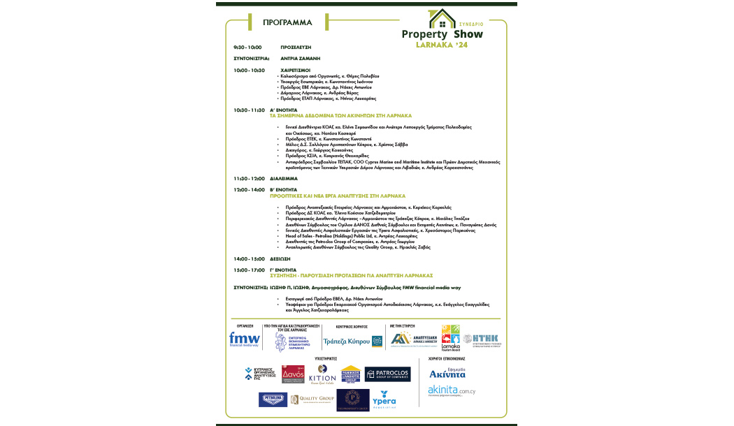 Το Εμπορικό και Βιομηχανικό Επιμελητήριο Λάρνακας τελεί υπό την αιγίδα του το 6ο Property Show Larnaka ‘24 με θέμα «Η Επόμενη μέρα για την Ανάπτυξη της Λάρνακας».   Το Συνέδριο οργανώνεται από την εταιρεία FMW με τη στήριξη της Εταιρείας Τουριστικής Ανάπτυξης (ΕΤΑΠ) Λάρνακας, την Αναπτυξιακή Εταιρεία Λάρνακας – Αμμοχώστου, και του ΕΤΕΚ και  θα πραγματοποιηθεί την Παρασκευή 26 Απριλίου και ώρα 10:00 – 17:00 στο ξενοδοχείο Radisson Blu στη Λάρνακα.